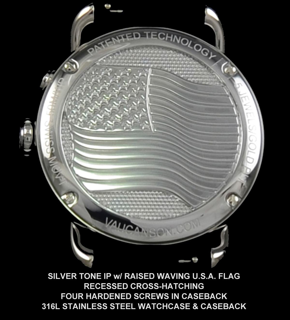 Silver tone IP caseback with recessed cross-hatching and a 3D raised waving USA flag.