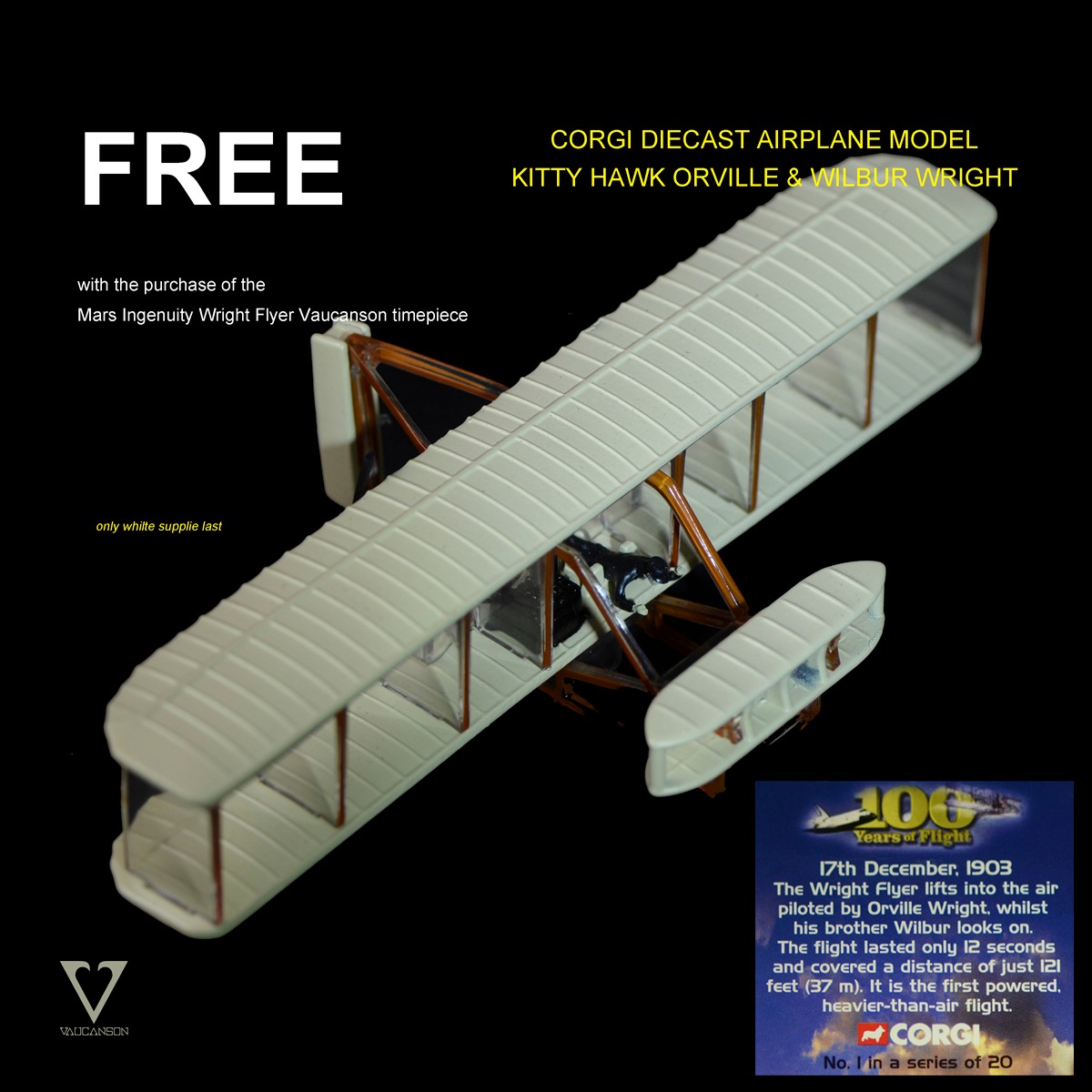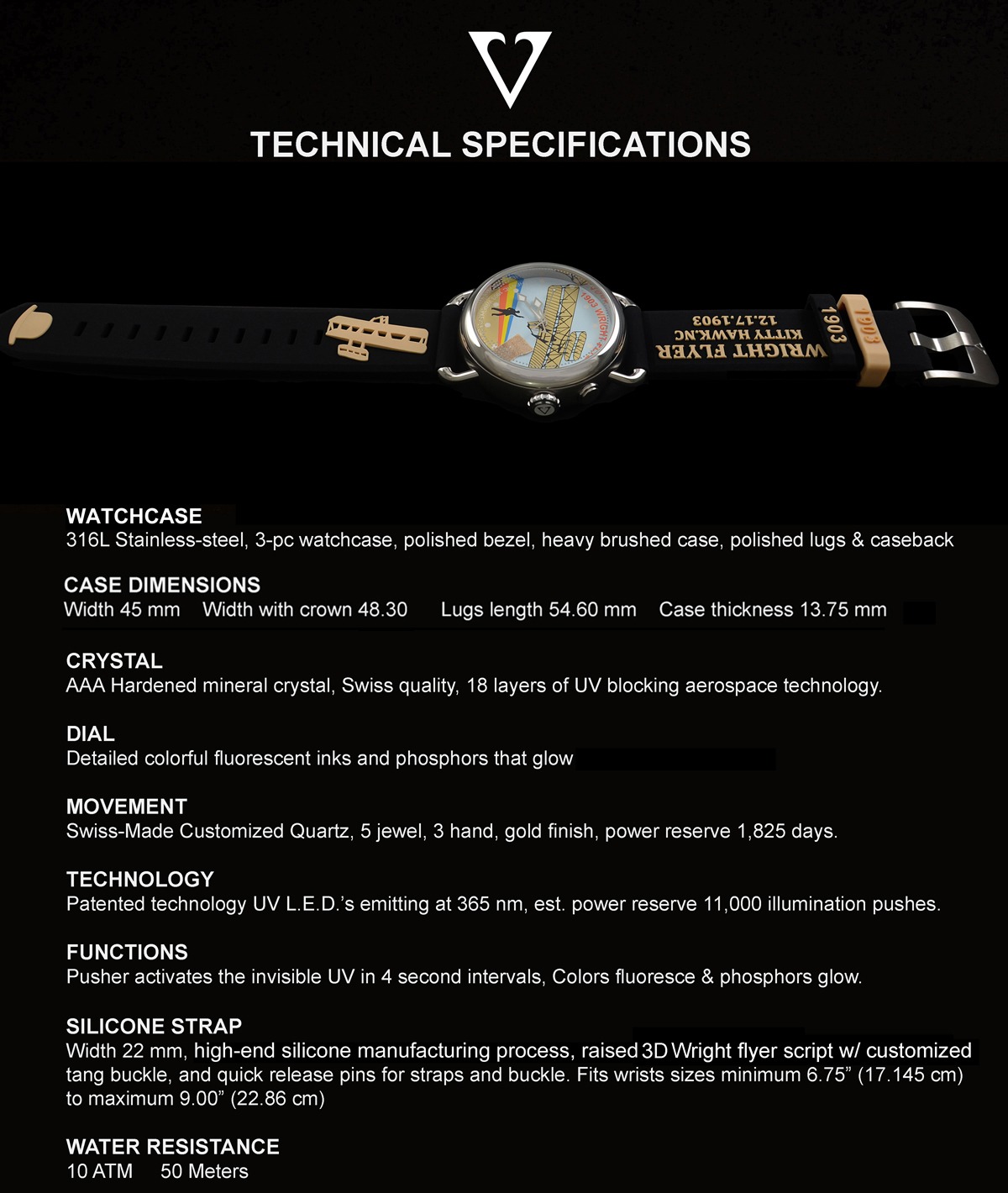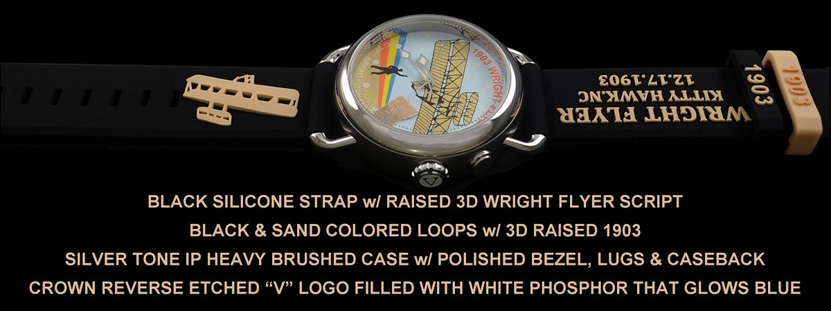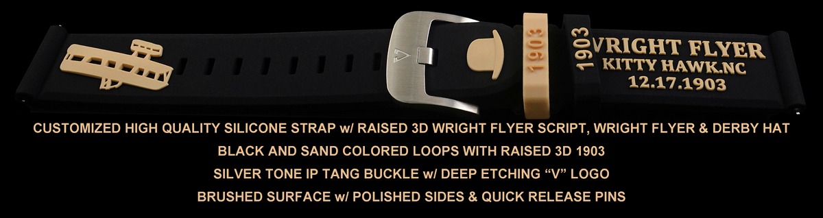 Each timepiece comes with a 3D Wright Flyer script, Wright Flyer, and Derby hat. The strap has quick-release pins and a beautiful silver tone tang buckle.