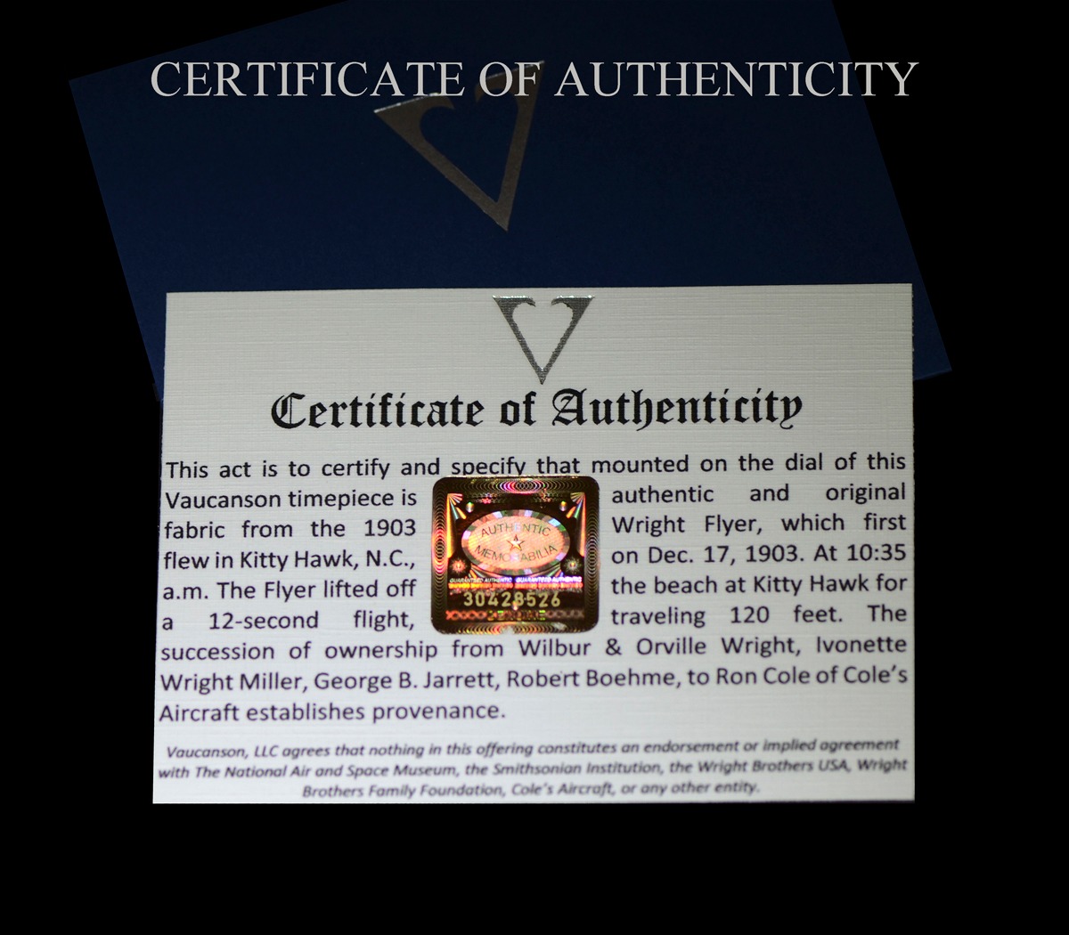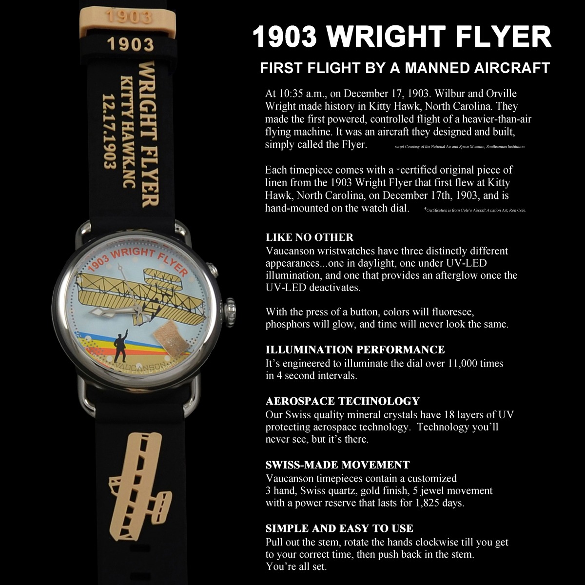 Now you can wear on your wrist an actual piece of the authentic and rare 1903 Wright Flyer fabric, which first flew in Kitty Hawk, N.C., on December 17th, 1903.