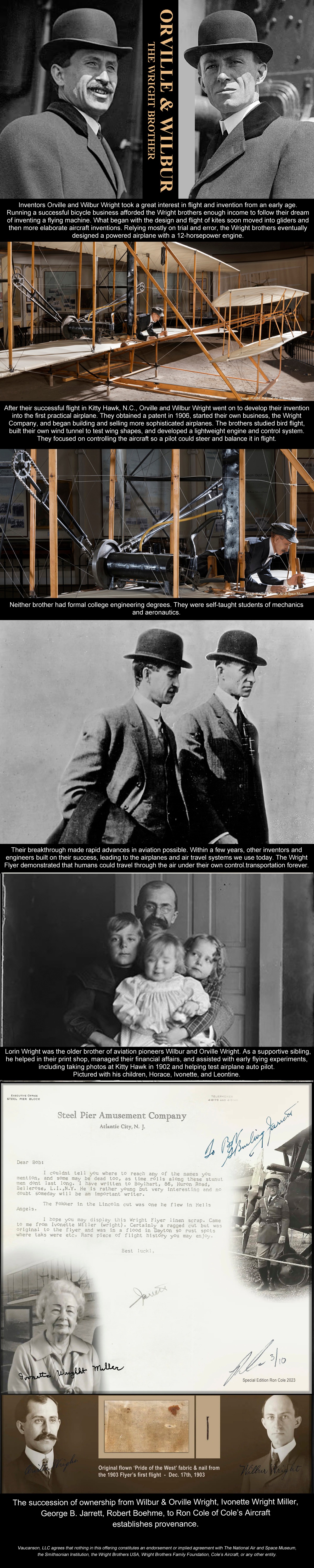 The flyer was in storage in Dayton in 1913 when a flood damaged the machine’s linen covering. Pending a tour of Europe, the Wrights recovered the flyer with all new material, but saved the original linen. In the 1930s, George B. Jarrett, owner and operator of the Steel Pier Amusement Company and The Jarrett Museum of World War History, obtained some of this original linen from Ivonette Wright Miller, who was the Wright family historian until her passing in 1995. In 1937, Jarrett shared some of this material with Robert (Bob) Boehme and mentioned that he'd obtained it from 'Ivonette Miller (Wright)'. Original letter from Col. George Jarrett describing Wright Flyer material. This letter will be included with each display. After the passing of Robert Boehme in 2012, Ron Cole and Cole's Aircraft obtained most of the latter's aviation collection in 2022.