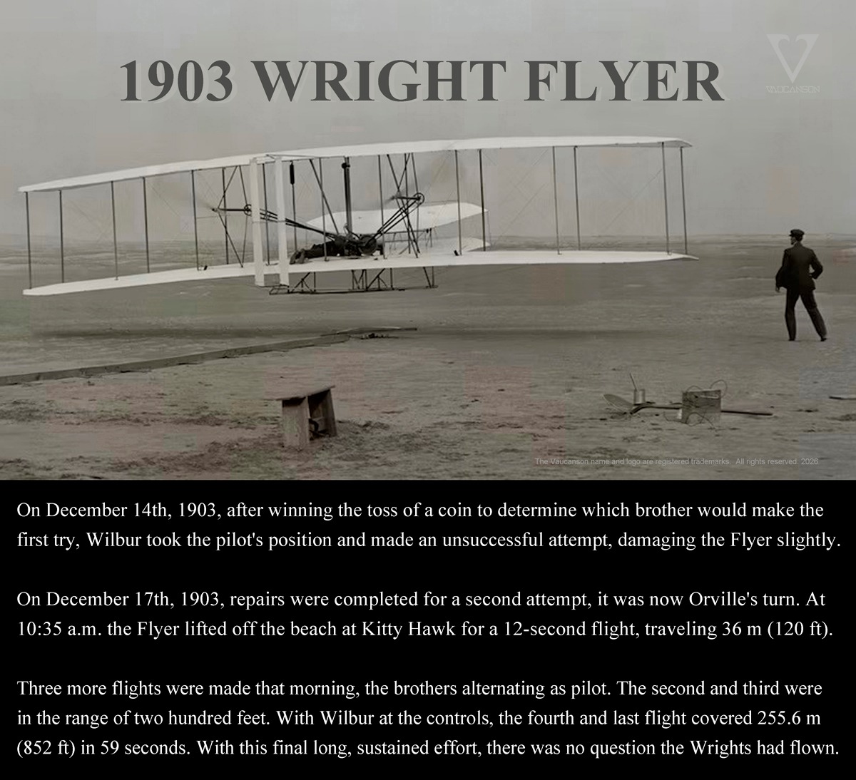 On December 14th, 1903, after winning the toss of a coin to determine which brother would make the first try, Wilbur took the pilot's position and made an unsuccessful attempt, damaging the Flyer slightly. On December 17th, 1903, repairs were completed for a second attempt; it was now Orville's turn. At 10:35 a.m. the Flyer lifted off the beach at Kitty Hawk for a 12-second flight, traveling 36 m (120 ft).