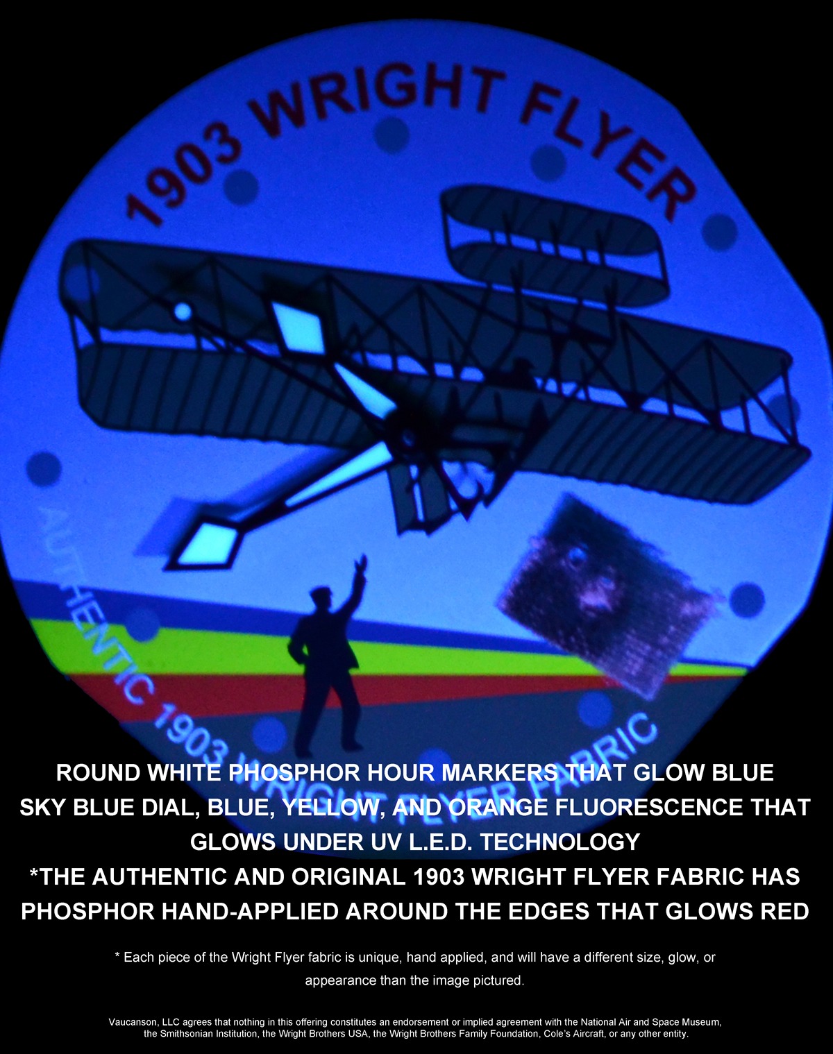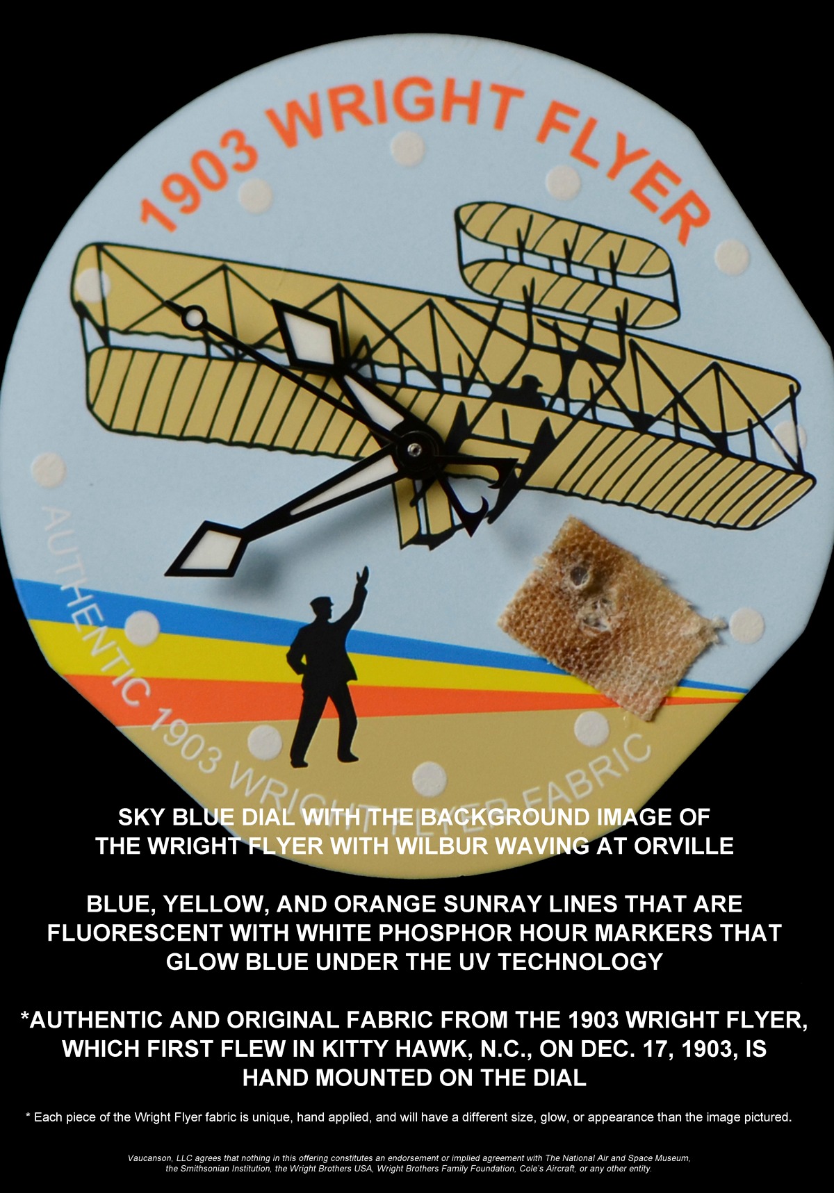 Authentic and original fabric from the 1903 Wright Flyer, which first flew in Kitty Hawk, N.C., on December 17th, 1903, is hand-mounted on the dial.