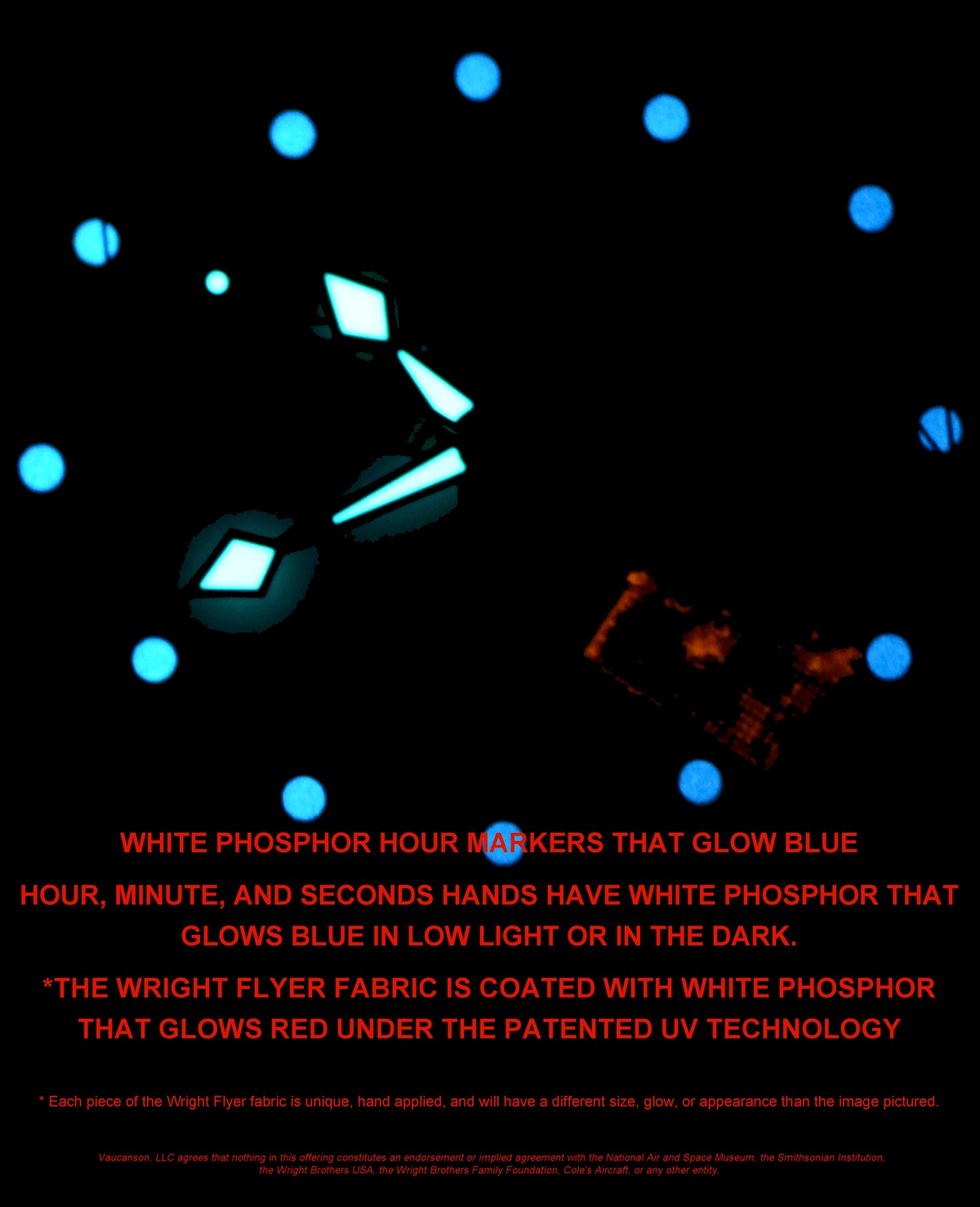Vaucanson timepieces have three distinctly different appearances; one in daylight, another under UV-LED illumination, and a third in the afterglow once the UV-LED deactivates.