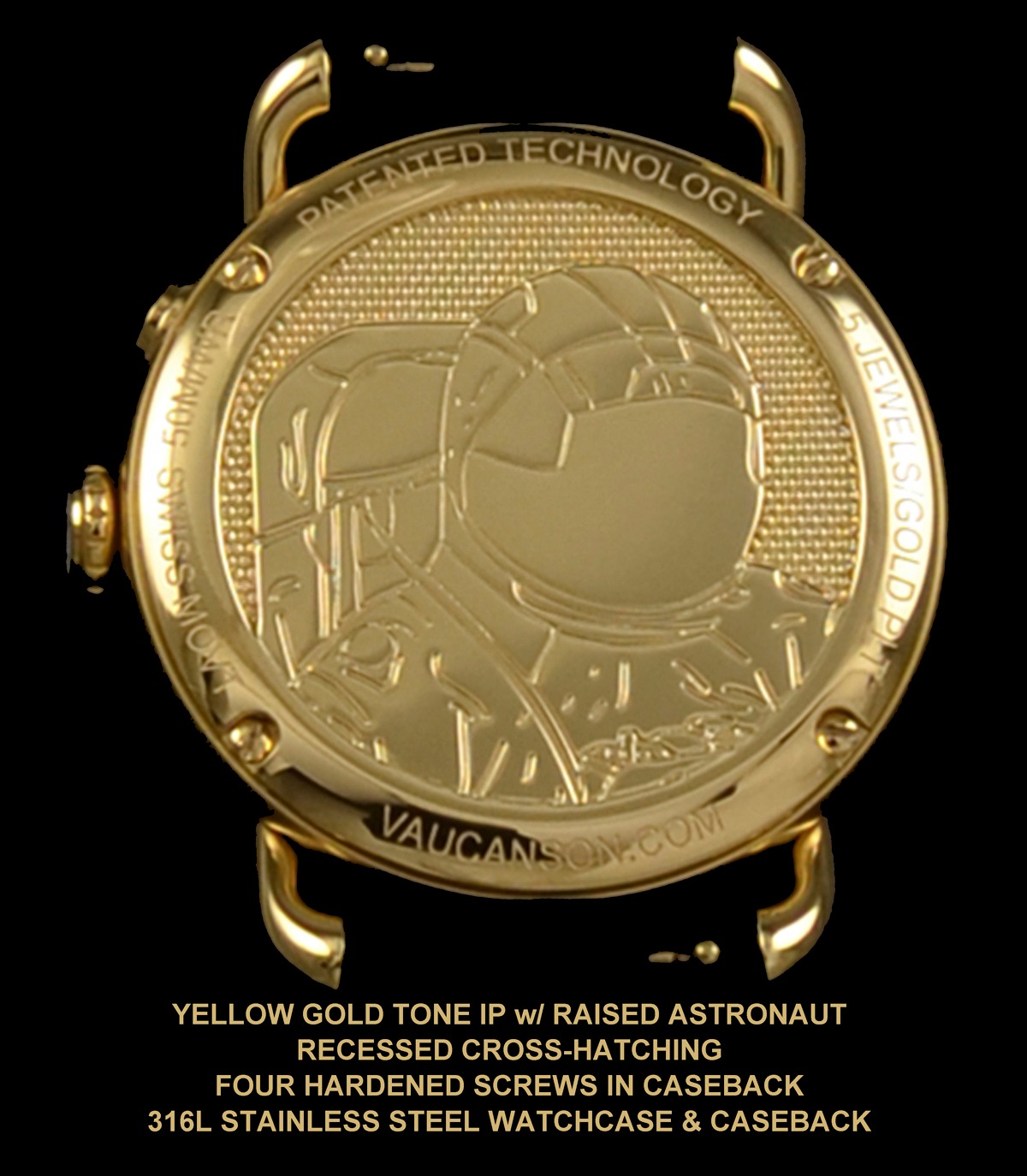 Yellow gold tone IP caseback with recessed cross-hatching and a 3D raised Astronaut.