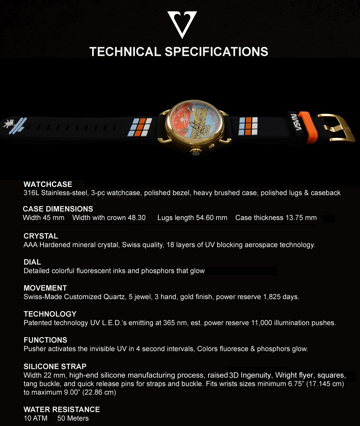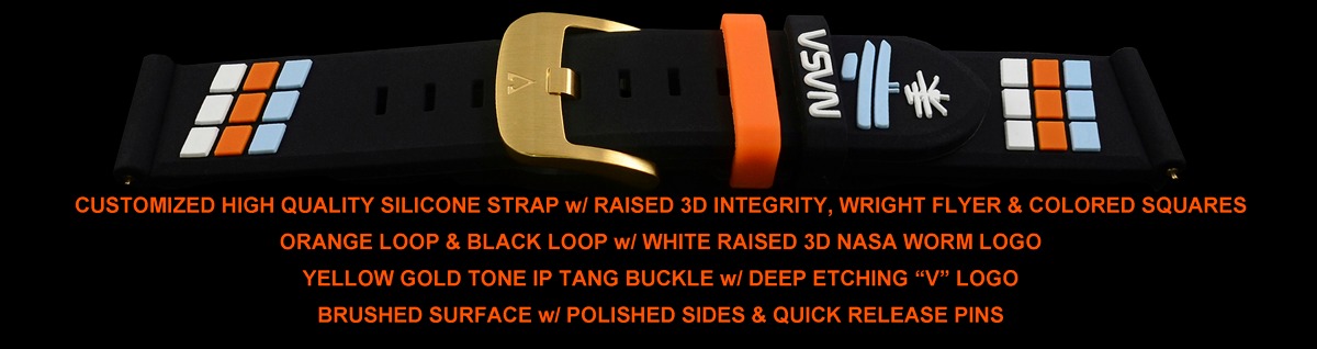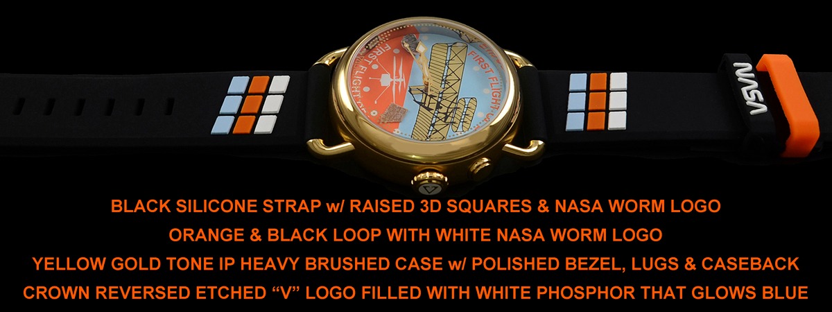 Each timepiece watch strap comes with a 3D Wright Flyer, Ingenuity, and colored cubes. The strap has quick-release pins and a beautiful yellow gold-tone tang buckle.