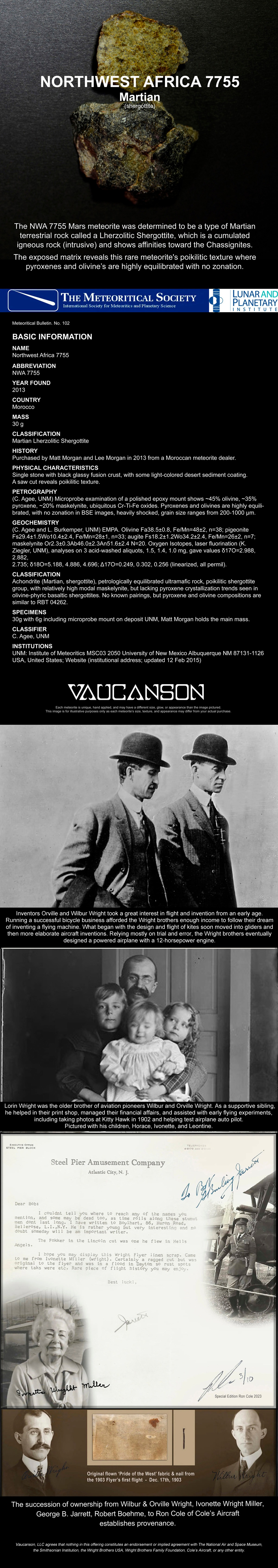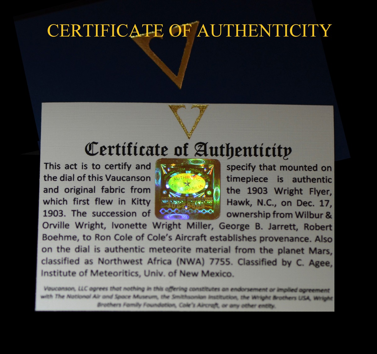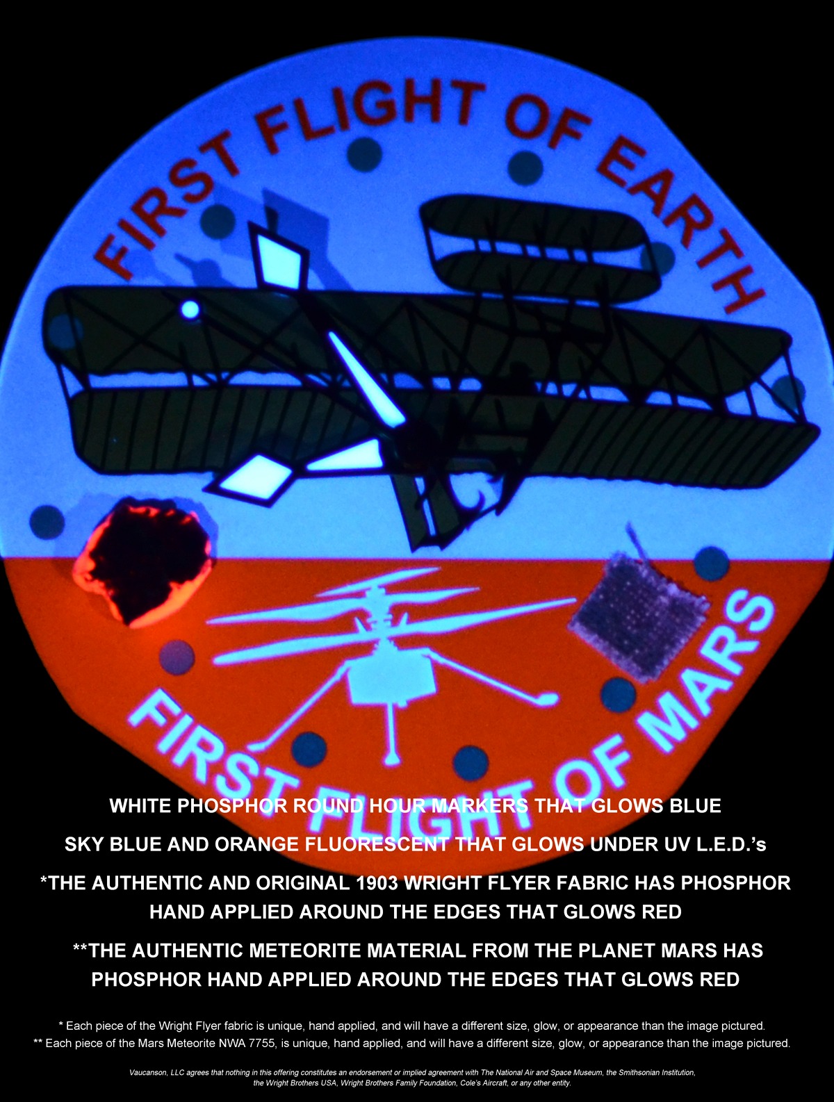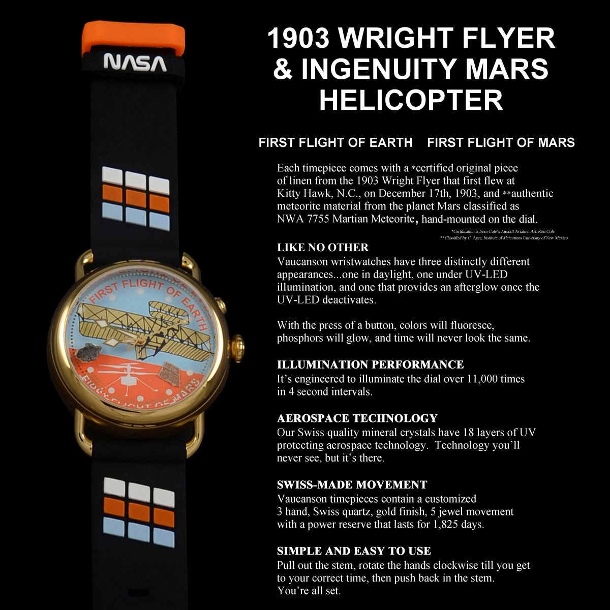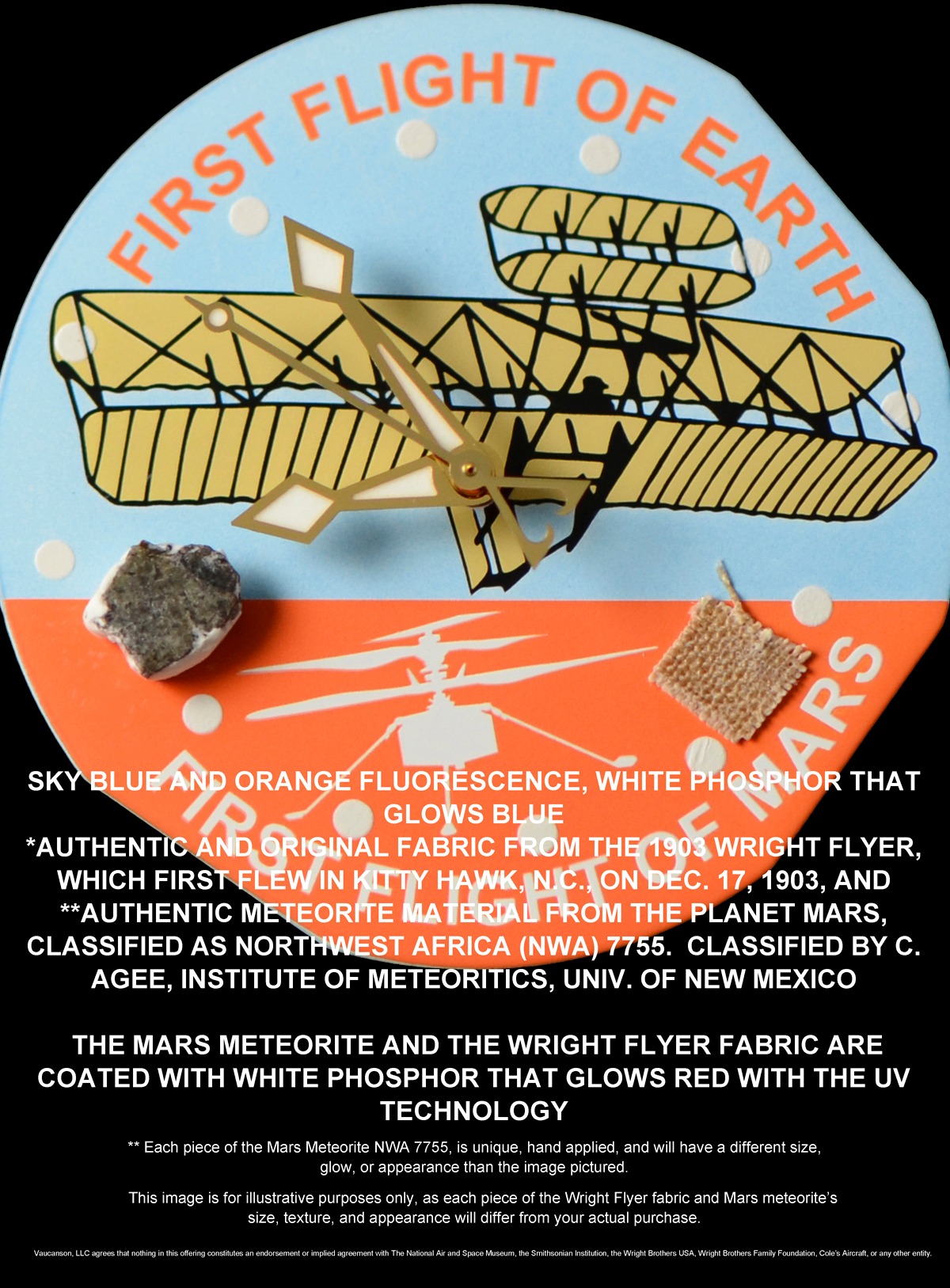 Now you can wear on your wrist an actual piece of Mars NWA 7755 and the authentic 1903 Wright Flyer fabric, which first flew in Kitty Hawk, N.C., on December 17th, 1903.