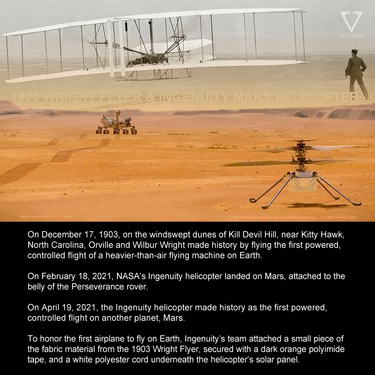 The Wrights used the same type of material, an unbleached muslin called “Pride of the West,” to cover their glider and aircraft wings. The Ingenuity Mars helicopter was built by JPL, which also manages the technology demonstration for NASA headquarters.