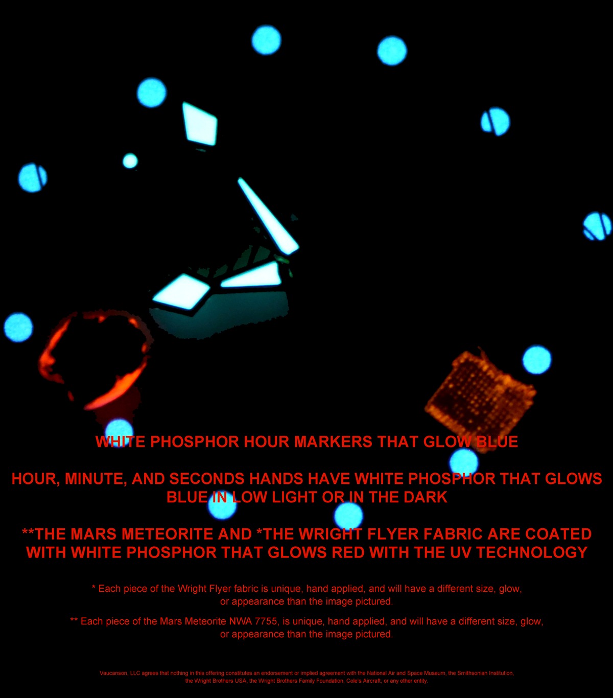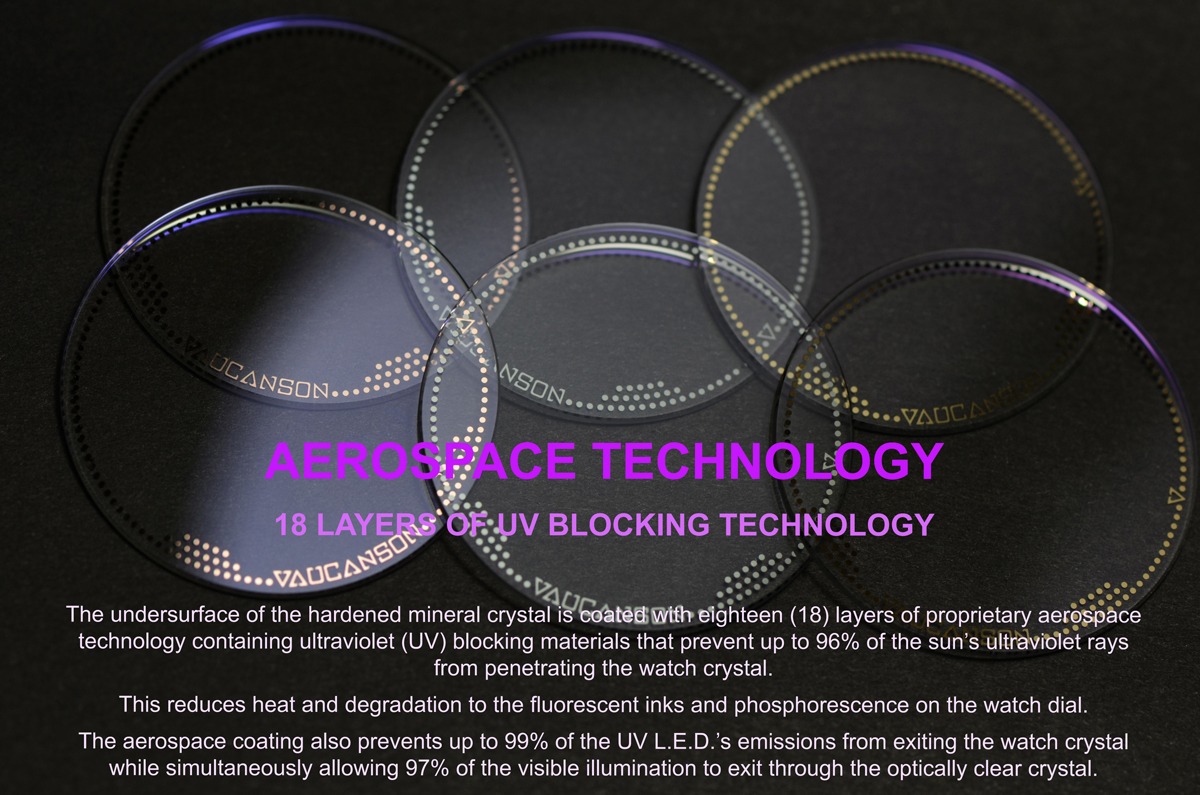Vaucanson timepieces have three distinctly different appearances; one in daylight, another under UV-LED illumination, and a third in the afterglow once the UV-LED deactivates.